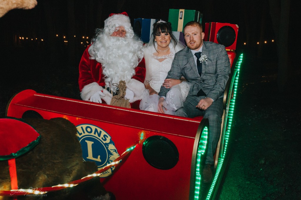 Reception venue: Cockley Woodland Weddings / Makeup: Makeup by Melana / Cake: Pink Wish Bakery / Limo: Jade Limo Hire / Dress: Elite Bridal / Santa: Denby Dale District Lions / Videography: Katie Byram Photography